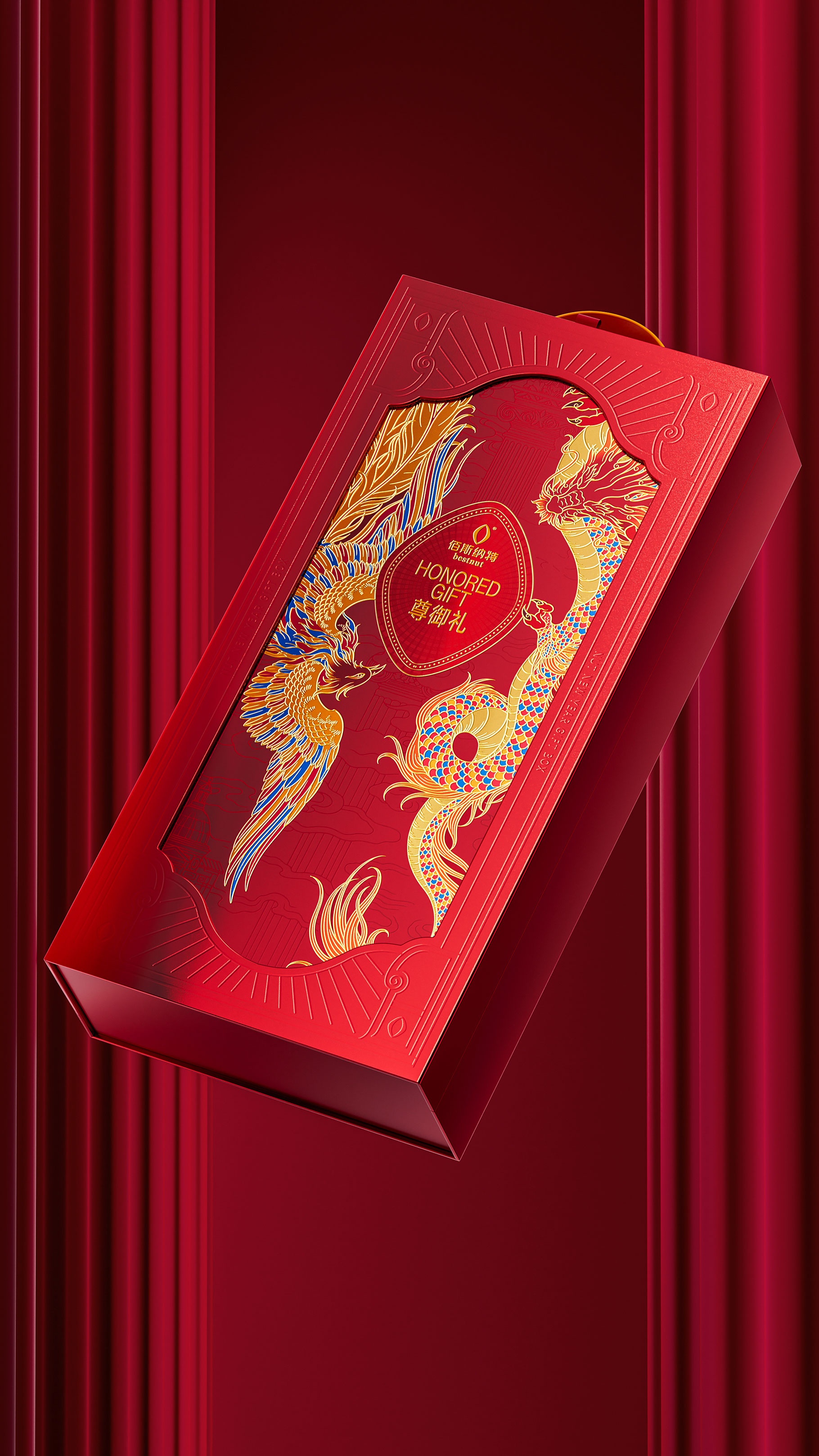 以紅、紫金色為主色調。紅色是新年的傳統色彩,代表著喜慶、熱情與活力,完美契合新年的歡樂氛圍。紫金色則象征著高貴與奢華,在古代常為皇室所用。將這兩種顏色相互搭配,禮盒主體以濃郁的紅色為底色,紫金色的主符號以及裝飾線條在其上熠熠生輝。比如,在禮盒的邊緣,用細膩的紫金色線條勾勒,既能強化禮盒的輪廓,又增添了一份精致感;在圖案的細節處,如龍鳳的鱗片、羽毛等部位,采用紫金色的燙金工藝,使其在紅色背景的襯托下,顯得更加華麗奪目,從視覺上全方位展現出尊貴與奢華。